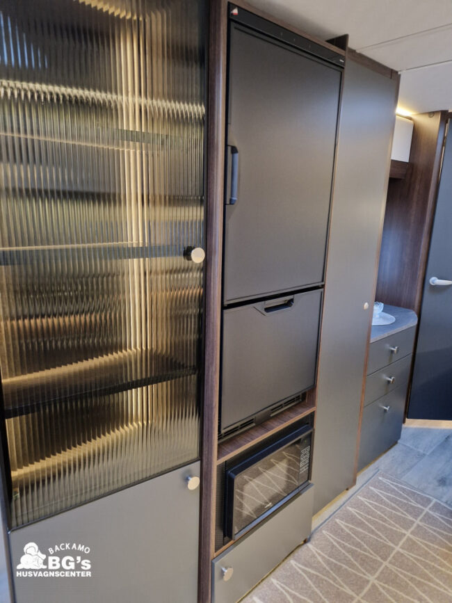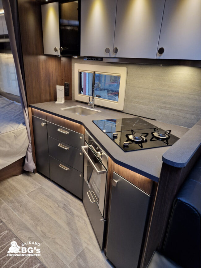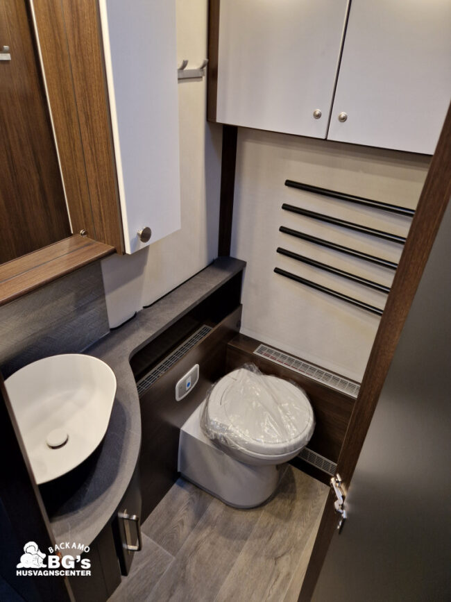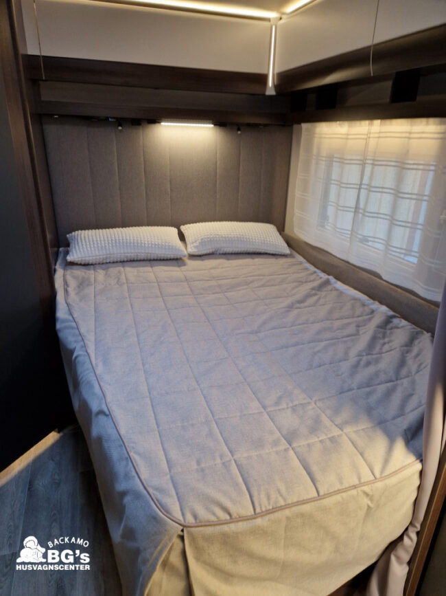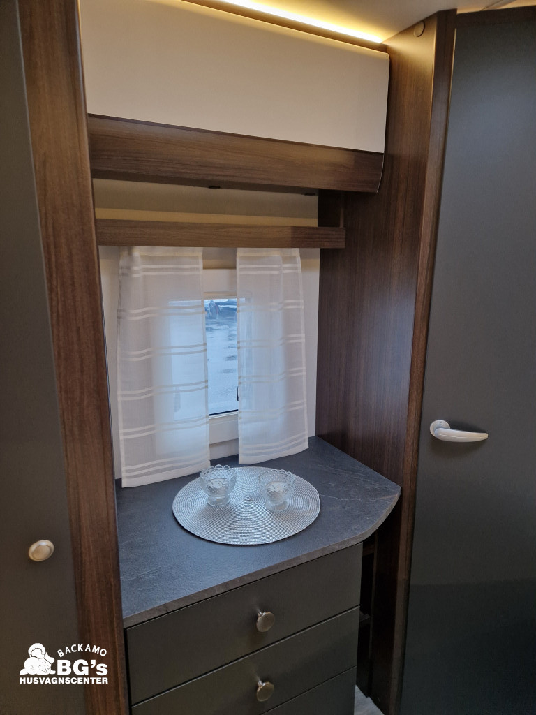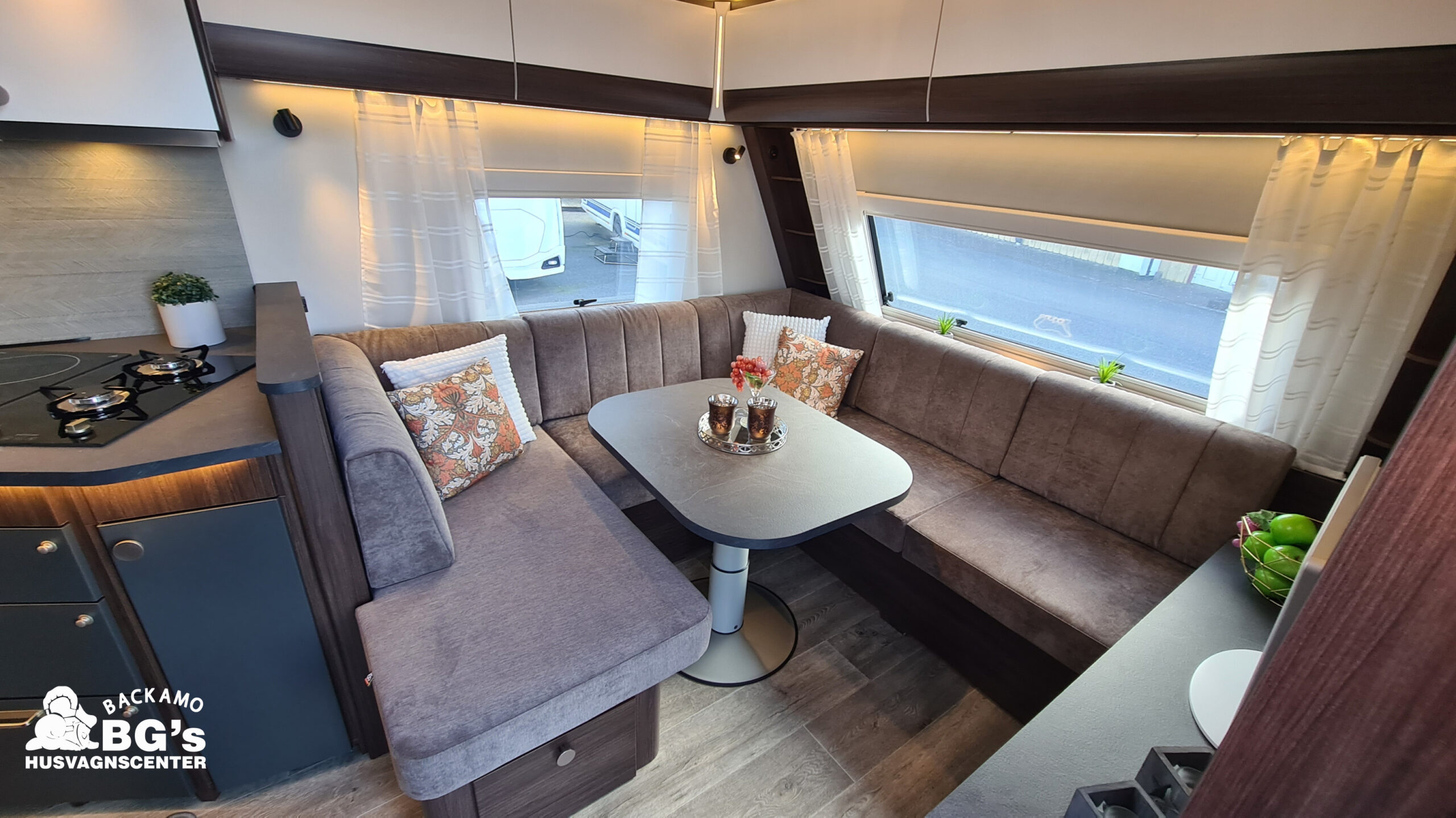 Induktionshäll/gasol 2+2 , Utvändigt gasoluttag, Avfallshinkar 2 st, Besticklåda, Elektrisk köksfläkt, Indirekt belysning undersida av diskbänk, Lock till diskho, Soft Close i kökslådor, Stort pentry fönster, Klädd kontinental sänggavel, Kudde extra 68 x 38, 2st, Överkast till säng, Pocketresår madrass, Ribbotten säng, Taklucka 280 x 280 Micro Heki i badrum, Invändig avloppstank 40 liter med utvändig tömning, Invändig färskvatten tank 60 liter med utvändig påfyllning, Nivåmätare avloppstank, Nivåmätare färskvatten, Varmvattenberedare, Vridbar elektrisk kassettoalett, Enhetligt låssystem med en nyckel till samtliga lås, Slät svart/vitplåt , Läckagetest gasol i koffert, Marknadens tjockaste isolering vägg/tak 37 mm golv 44 mm, Sandwichkonstruktion väggar och golv, Skid/lastlucka med belysning och utdragbar botten på dörrsida, Mellantonade fönster, Optimerad ventilation med luftspalter, Slät utsida på fönster, Steglös öppning av fönster (ej gavelfönster fast), Steglös reglerbara myggnät i fönster (ej gavelfönster), Steglös reglerbara rullgardiner i fönster, Ventilerade fönsterkarmar, Batteri 100 Ah AGM, Batteriladdare 30 A, Batteritestare, Förtältsbelysning över ytterdörr, Förtältservice inkl. 12V/230V Tv-anten in/ut, Jordfelsbrytare, LED belysning gasolkoffert, LED belysning skidlucka, Ledstripe fönster fram, Sängbelysning med USB uttag i lampsockel, Trafikbelysning LED, 2 högtalare fram, Högtalare bak, 230 V-uttag i fönsterhylla, Ergonomiska sittdynor, Integrerade USB uttag i läslamp sockel, TV-plats ink 230 V och antennuttag, Elpatron 3 kW, Inom och utomhustermometer, Panna Alde compact 3020, Uppvärmt avlopp, Vattenburen centralvärme gasol 6.3 kW och el 3.0 kW, Vattenburen golvvärme med reglerbar cirkulationspump (Polar floor heating system), 2 års funktionsgaranti, 7 års täthetsgaranti, Viktintyg inklusive utrustning följer samtliga vagnar, ord.pris: 759.000:-,