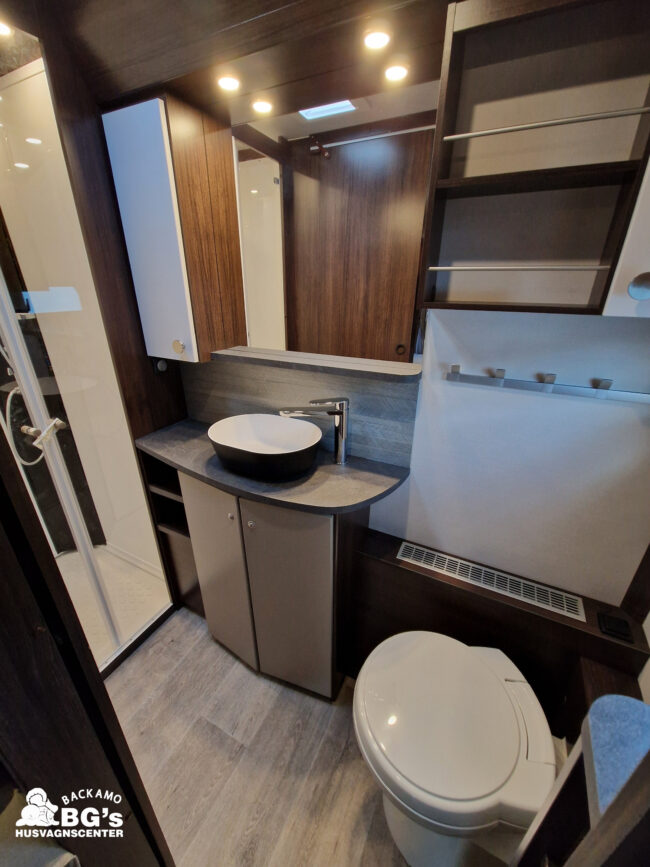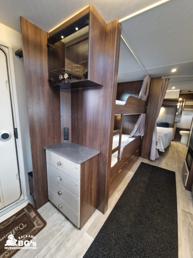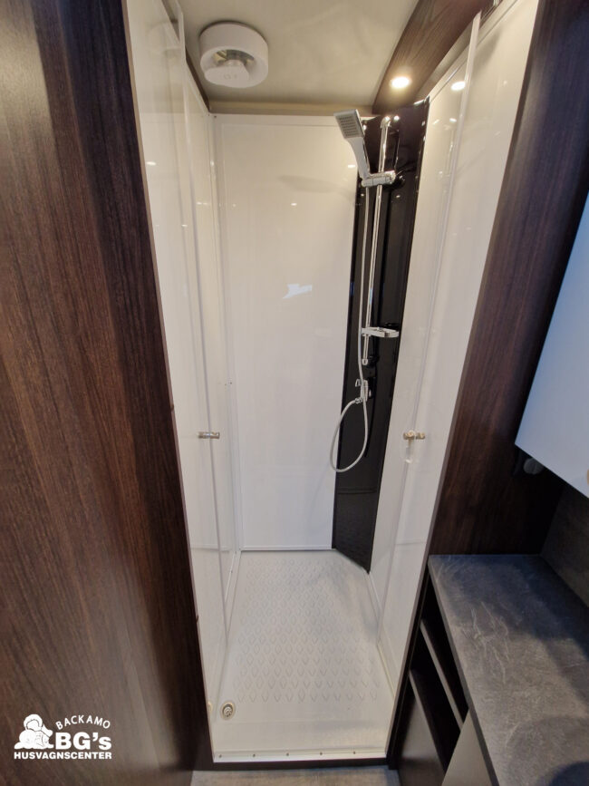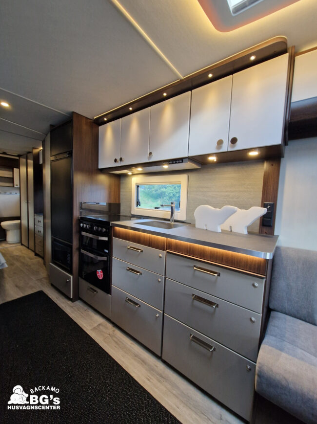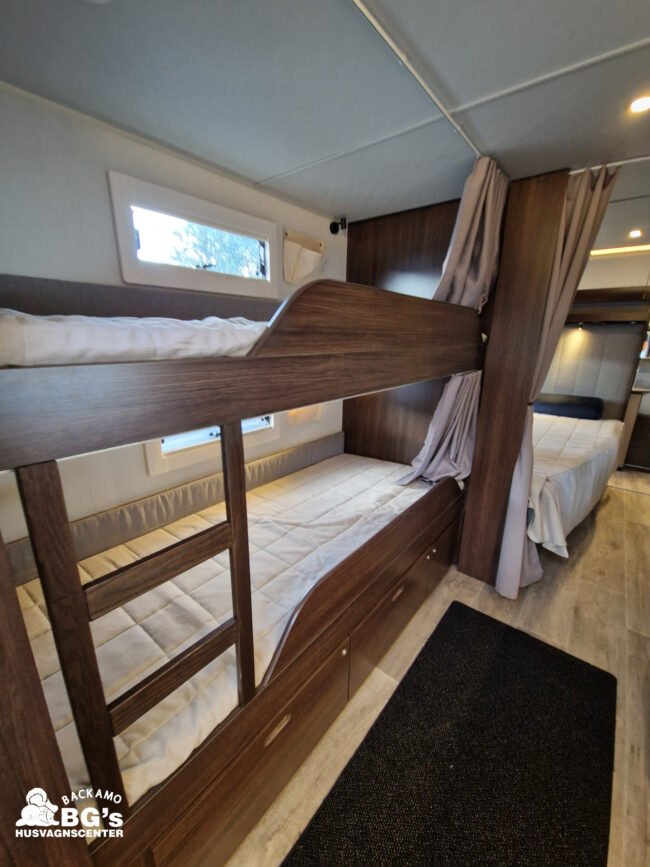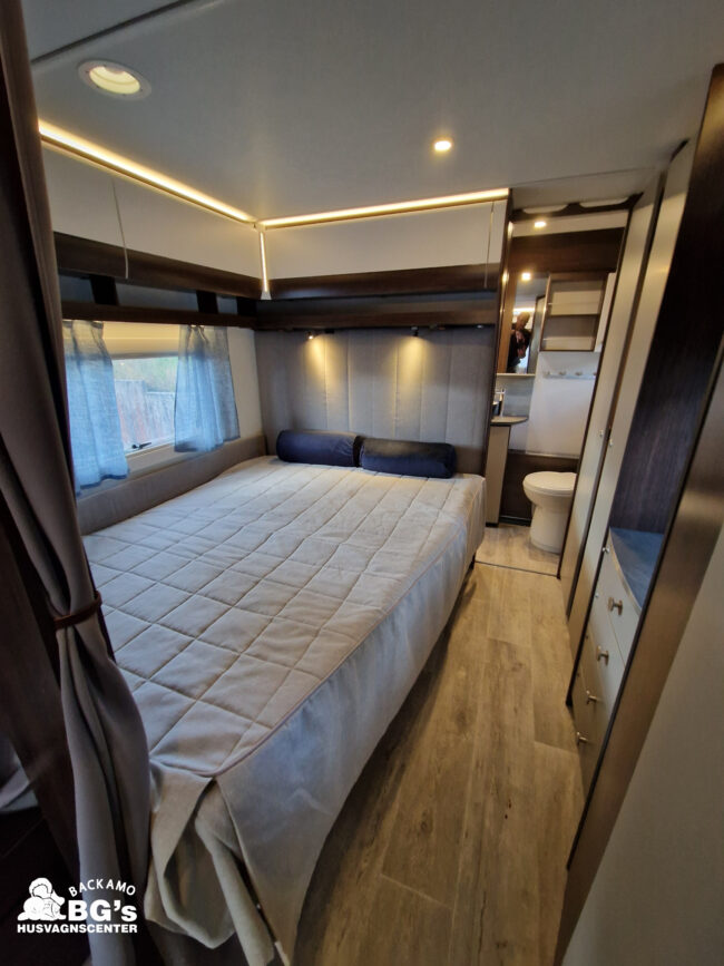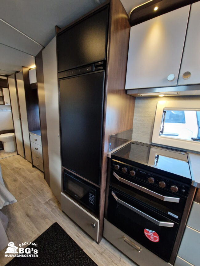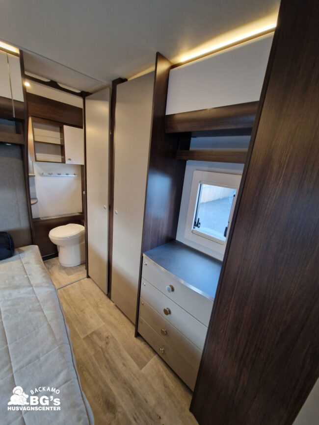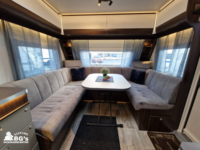 4-lågig spis med glaslock och elektrisk tändning, Gasolugn, Avfallshinkar 2 st, Besticklåda, Elektrisk köksfläkt, Indirekt belysning undersida av diskbänk, Lock till diskho, Soft Close i kökslådor, Stort pentry fönster, 3 cm tjock bäddmadrass, Klädd kontinental sänggavel, Överkast till säng, Pocketresår madrass, Ribbotten säng, Taklucka 280 x 280 Micro Heki i badrum, Invändig avloppstank 40 liter med utvändig tömning, Invändig färskvatten tank 40 liter med utvändig påfyllning, Nivåmätare avloppstank, Nivåmätare färskvatten, Varmvattenberedare, Vridbar elektrisk kassettoalett, Enhetligt låssystem med en nyckel till samtliga lås, Slät blå/vit plåt , Läckagetest gasol i koffert, Marknadens tjockaste isolering vägg/tak 37 mm golv 44 mm, Sandwichkonstruktion väggar och golv, Skid/lastlucka med belysning och utdragbar botten på dörrsida, Mellantonade fönster, Optimerad ventilation med luftspalter, Slät utsida på fönster, Steglös öppning av fönster (ej gavelfönster fast), Steglös reglerbara myggnät i fönster (ej gavelfönster), Steglös reglerbara rullgardiner i fönster, Ventilerade fönsterkarmar, Batteri 75 Ah, Batteriladdare 30 A, Batteritestare, Förtältsbelysning över ytterdörr, Förtältservice inkl. 12V/230V Tv-anten in/ut, Jordfelsbrytare, LED belysning gasolkoffert, LED belysning skidlucka, Ledstripe fönster fram, Sängbelysning med USB uttag i lampsockel, Trafikbelysning LED, 2 högtalare fram, 230 V-uttag i fönsterhylla, Ergonomiska sittdynor, Integrerade USB uttag i läslamp sockel, TV-plats ink 230 V och antennuttag, Elpatron 3 kW, Inom och utomhustermometer, Panna Alde compact 3030, Uppvärmt avlopp, Vattenburen centralvärme gasol 6.3 kW och el 3.0 kW, Vattenburen golvvärme med reglerbar cirkulationspump (Polar floor heating system), 2 års funktionsgaranti, 7 års täthetsgaranti, Viktintyg inklusive utrustning följer samtliga vagnar, Alternativa totalvikter finns,