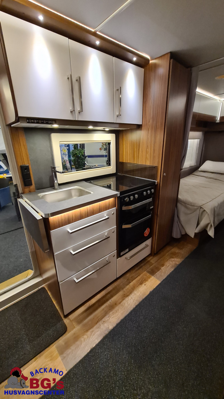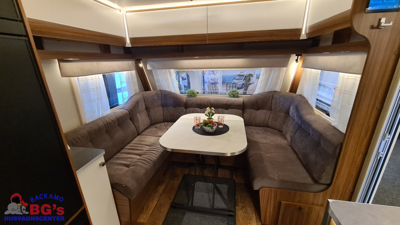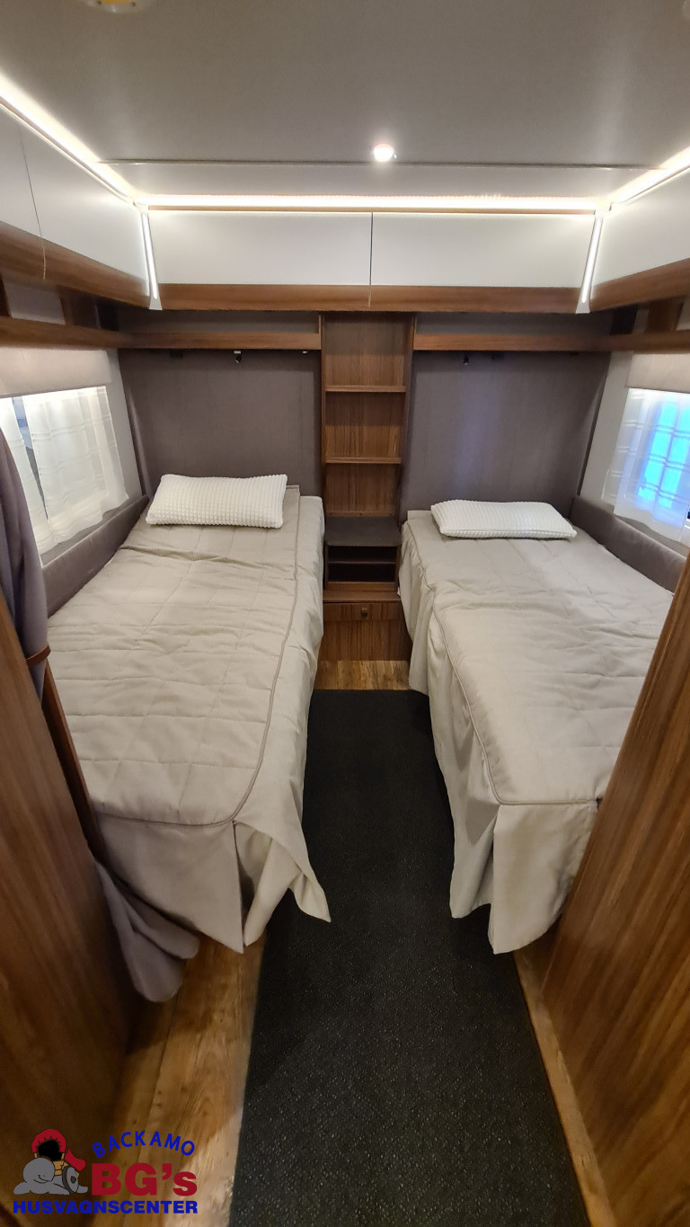 4-lågig spis med glaslock och elektrisk tändning, Avfallshinkar 2 st, Besticklåda, Elektrisk köksfläkt, Indirekt belysning undersida av diskbänk, Lock till diskho, Soft Close i kökslådor, Stort pentry fönster, 3 cm tjock bäddmadrass, Draperi till våningssängar i C-vagnar, Förvaringsfickor i alla C-vagnar, Klädd kontinental sänggavel, Kudde extra 68 x 38, 2st, Lådor under våningssäng i C-vagnar, Överkast till sängar, Pocketresår madrasser, Ribbotten sängar, Taklucka 280 x 280 Micro Heki i badrum, Invändig avloppstank 40 liter med utvändig tömning, Invändig färskvatten tank 40 liter med utvändig påfyllning, Nivåmätare avloppstank, Nivåmätare färskvatten, Varmvattenberedare, Vridbar elektrisk kassettoalett, Enhetligt låssystem med en nyckel till samtliga lås, Kulhamrad blå/vitplåt , Läckagetest gasol i koffert, Marknadens tjockaste isolering vägg/tak 37 mm golv 44 mm, Sandwichkonstruktion väggar och golv, Skid/lastlucka med belysning och utdragbar botten på dörrsida, Mellantonade fönster, Optimerad ventilation med luftspalter, Slät utsida på fönster, Steglös öppning av fönster (ej gavelfönster fast), Steglös reglerbara myggnät i fönster (ej gavelfönster), Steglös reglerbara rullgardiner i fönster, Ventilerade fönsterkarmar, Batteri 75 Ah, Batteriladdare 30 A, Batteritestare, Förtältsbelysning över ytterdörr, Förtältservice inkl. 12V/230V Tv-anten in/ut, Jordfelsbrytare, LED belysning gasolkoffert, LED belysning skidlucka, Ledstripe fönster fram, Sängbelysning med USB uttag i lampsockel, Trafikbelysning LED, 2 högtalare fram, 230 V-uttag i fönsterhylla, Ergonomiska sittdynor, Integrerade USB uttag i läslamp sockel, TV-plats ink 230 V och antennuttag, Elpatron 3 kW, Inom och utomhustermometer, Panna Alde compact 3020, Uppvärmt avlopp, Vattenburen centralvärme gasol 6.3 kW och el 3.0 kW, Vattenburen golvvärme med reglerbar cirkulationspump (Polar floor heating system), 2 års funktionsgaranti, 7 års täthetsgaranti, Viktintyg inklusive utrustning följer samtliga vagnar, Alternativa totalvikter finns, ord.pris: 594.100:-,