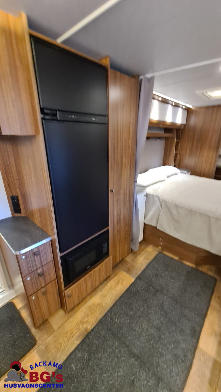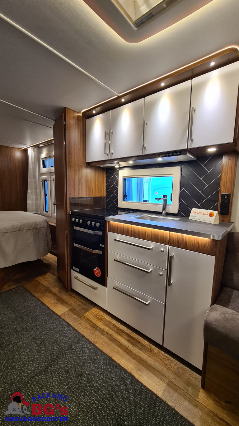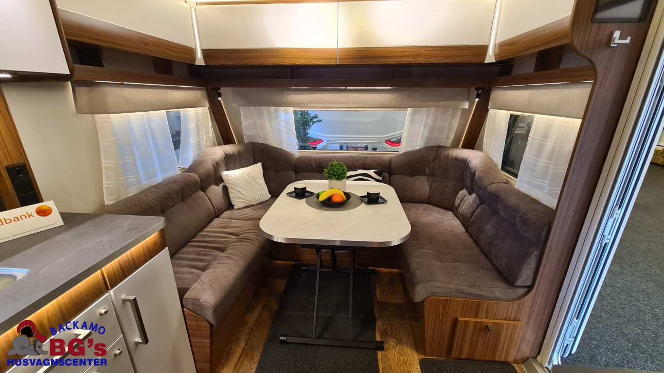 -lågig spis med glaslock och elektrisk tändning, Avfallshinkar 2 st, Besticklåda, Elektrisk köksfläkt, Indirekt belysning undersida av diskbänk, Lock till diskho, Soft Close i kökslådor, Stort pentry fönster, 3 cm tjock bäddmadrass, Draperi till våningssängar i C-vagnar, Förvaringsfickor i alla C-vagnar, Klädd kontinental sänggavel, Kudde extra 68 x 38, 2st, Lådor under våningssäng i C-vagnar, Överkast till sängar, Pocketresår madrasser, Ribbotten sängar, Taklucka 280 x 280 Micro Heki i badrum, Invändig avloppstank 40 liter med utvändig tömning, Invändig färskvatten tank 40 liter med utvändig påfyllning, Nivåmätare avloppstank, Nivåmätare färskvatten, Varmvattenberedare, Vridbar elektrisk kassettoalett, Enhetligt låssystem med en nyckel till samtliga lås, Kulhamrad blå/vitplåt , Läckagetest gasol i koffert, Marknadens tjockaste isolering vägg/tak 37 mm golv 44 mm, Sandwichkonstruktion väggar och golv, Skid/lastlucka med belysning och utdragbar botten på dörrsida, Mellantonade fönster, Optimerad ventilation med luftspalter, Slät utsida på fönster, Steglös öppning av fönster (ej gavelfönster fast), Steglös reglerbara myggnät i fönster (ej gavelfönster), Steglös reglerbara rullgardiner i fönster, Ventilerade fönsterkarmar, Batteri 75 Ah, Batteriladdare 30 A, Batteritestare, Förtältsbelysning över ytterdörr, Förtältservice inkl. 12V/230V Tv-anten in/ut, Jordfelsbrytare, LED belysning gasolkoffert, LED belysning skidlucka, Ledstripe fönster fram, Sängbelysning med USB uttag i lampsockel, Trafikbelysning LED, 2 högtalare fram, 230 V-uttag i fönsterhylla, Ergonomiska sittdynor, Integrerade USB uttag i läslamp sockel, TV-plats ink 230 V och antennuttag, Elpatron 3 kW, Inom och utomhustermometer, Panna Alde compact 3020, Uppvärmt avlopp, Vattenburen centralvärme gasol 6.3 kW och el 3.0 kW, Vattenburen golvvärme med reglerbar cirkulationspump (Polar floor heating system), 2 års funktionsgaranti, 7 års täthetsgaranti, Viktintyg inklusive utrustning följer samtliga vagnar, Alternativa totalvikter finns, ord.pris: 745.550:-,